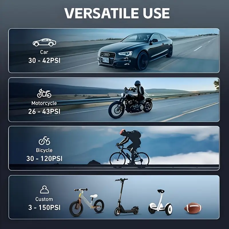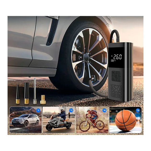 Компресор підходить не лише для автошин, а й для велосипедів, мотоциклів, м’ячів, матраців, надувних іграшок. Універсальний набір насадок завжди стане у пригоді.