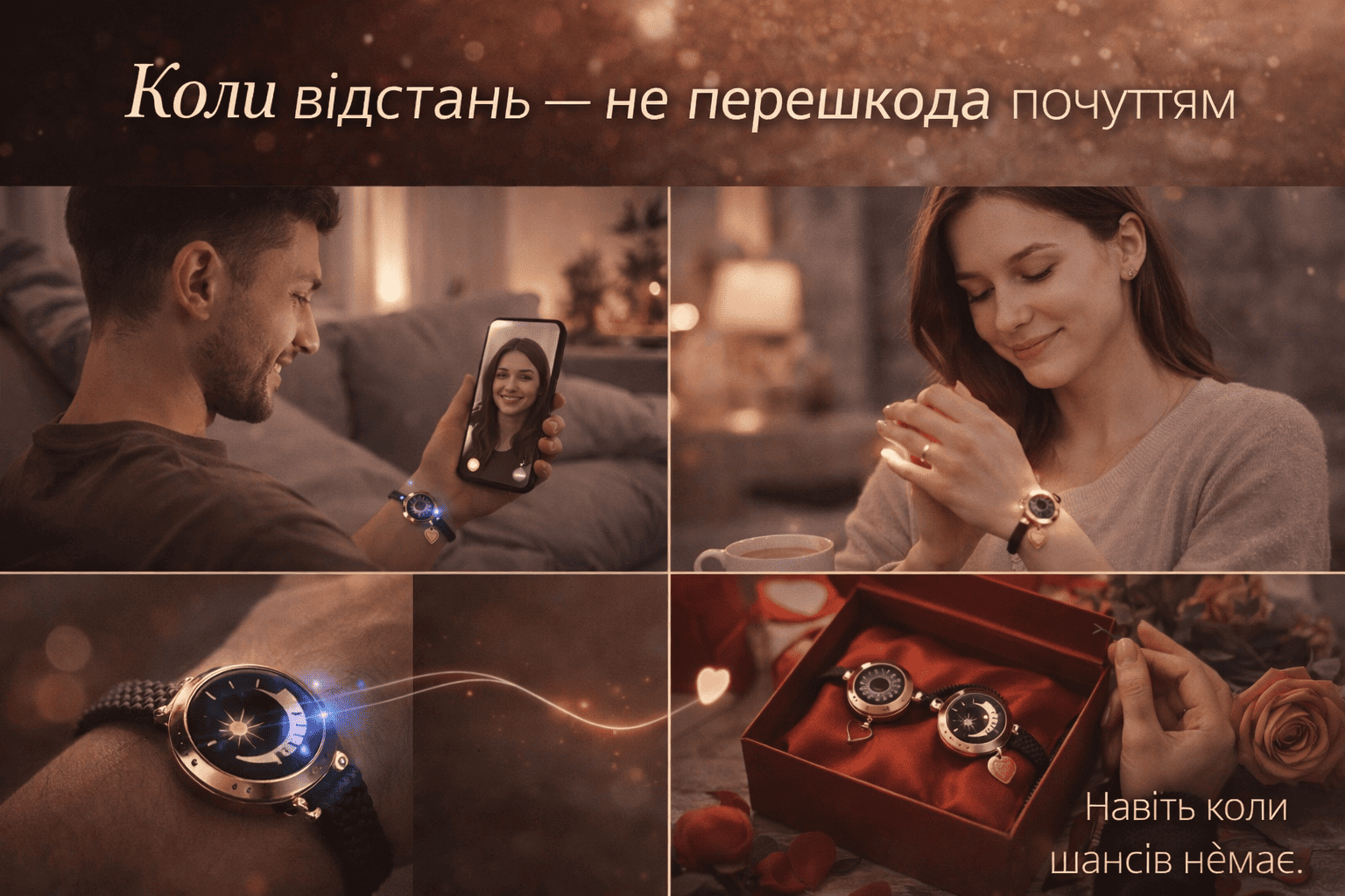 Sun & Moon — це комплект із 2 смарт-браслетів для пари. Коли ти торкаєшся свого браслета — його браслет миттєво реагує: легкий світловий імпульс 💓 ніжна вібрація