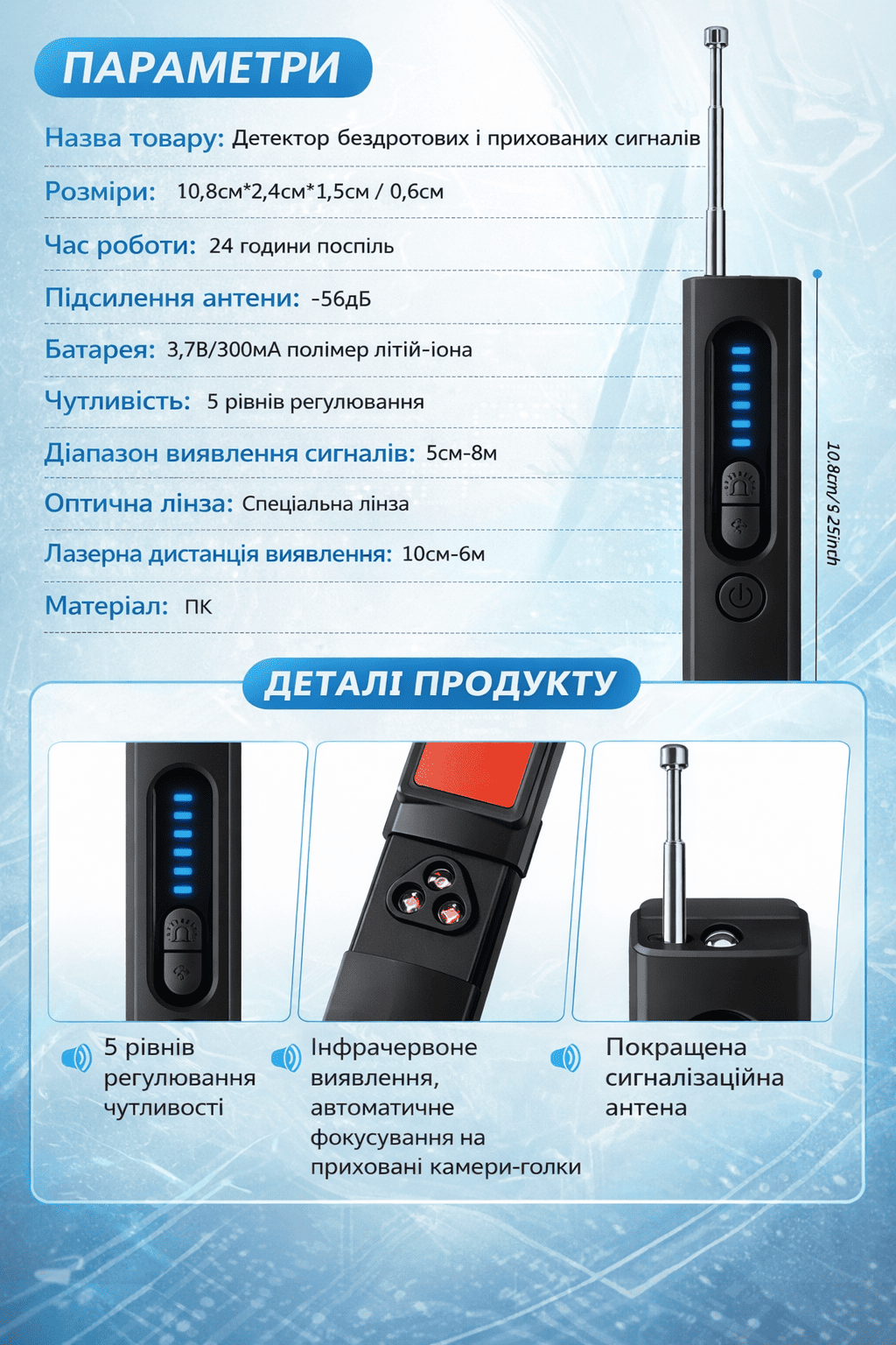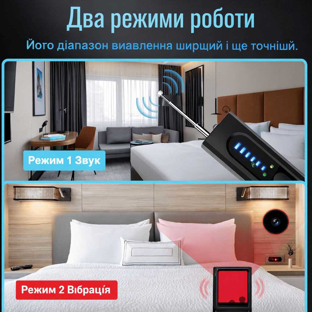 Завдяки  двом спеціалізованим режимам виявлення — звуку та вібрації — цей пристрій пропонує ширший діапазон виявлення та вищу точність. Незалежно від того, чи ідентифікує аудіоспостереження, чи фізичні пристрої відстеження, він забезпечує повне покриття та надійні результати.
