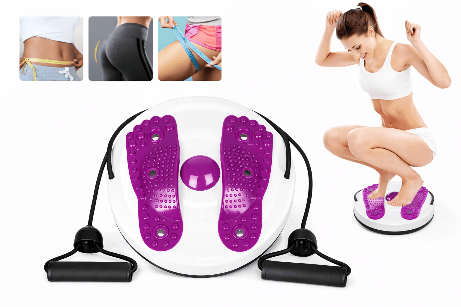 Диск з еспандерами розвиває координацію та гнучкість хребта. Тренує м’язи преса, ніг і сідниць. Допомагає знизити вагу та сформувати талію.