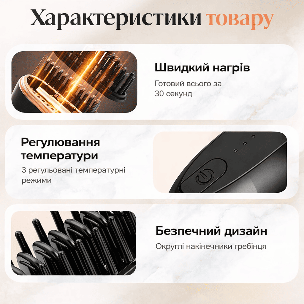 Дуже зручний формат! Брала для поїздок, але тепер користуюсь щодня. Нагрівається швидко, волосся після нього гладке й блискуче, без пухнастості. Особливо подобається, що бездротовий — нічого не заважає під час укладки.
