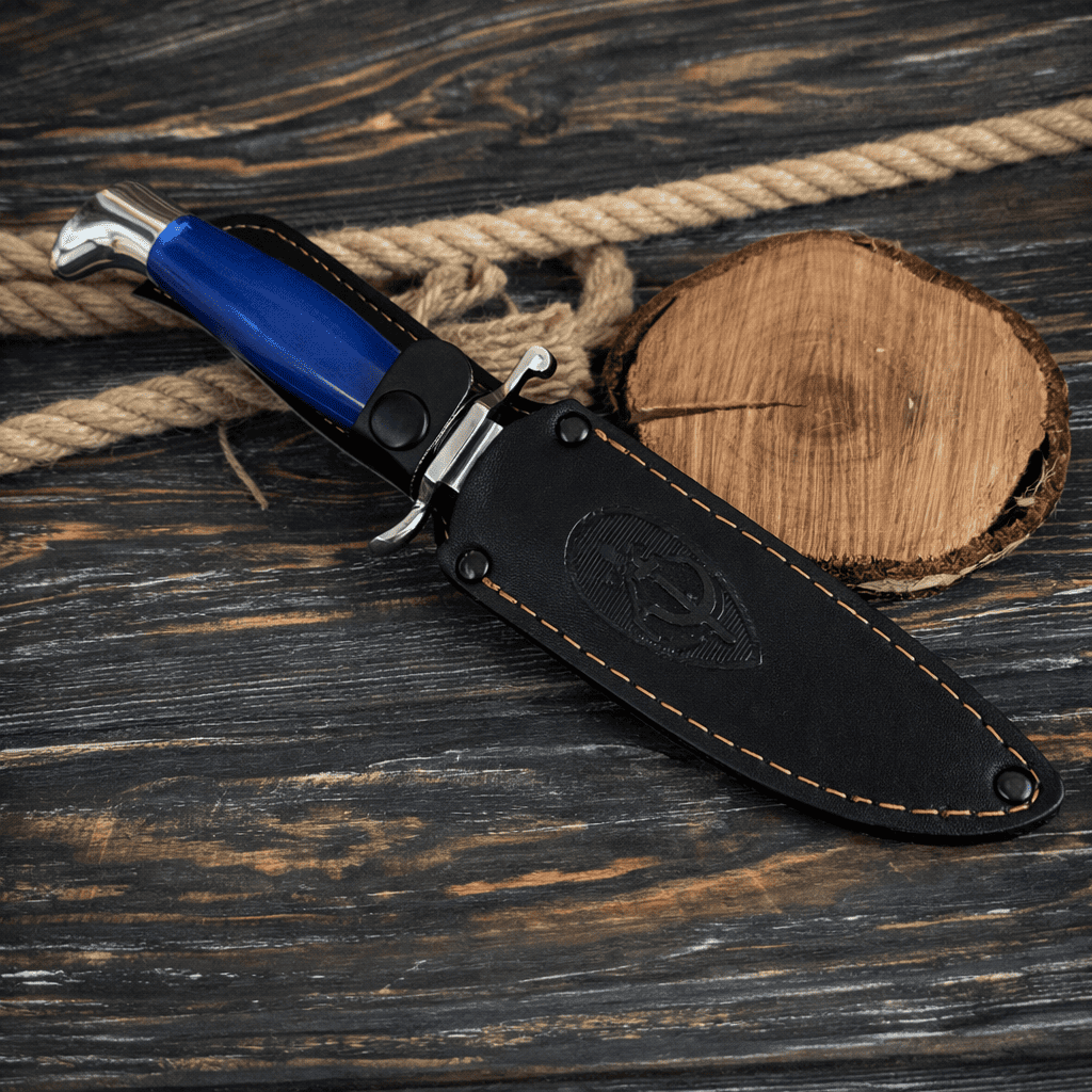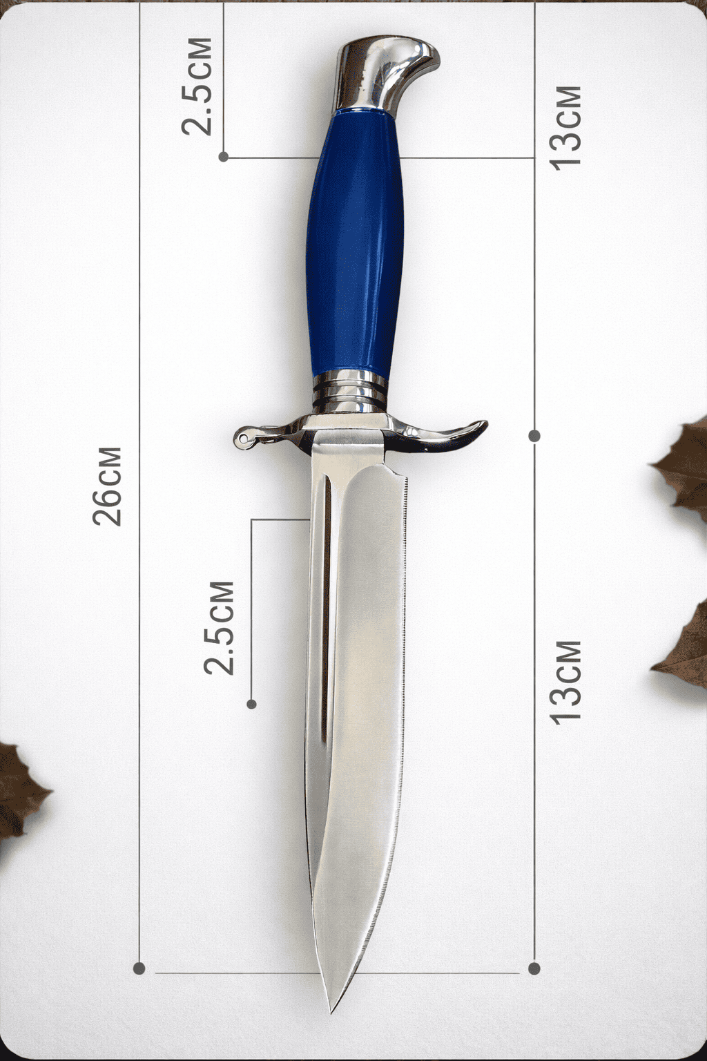 Фінка з синьою рукояттю з акрилу – це класичний ніж, що поєднує дизайн і практичність. Його ретельно продумана форма ідеально підходить для різання та виконання колючих рухів, завдяки чому цей ніж стає універсальним