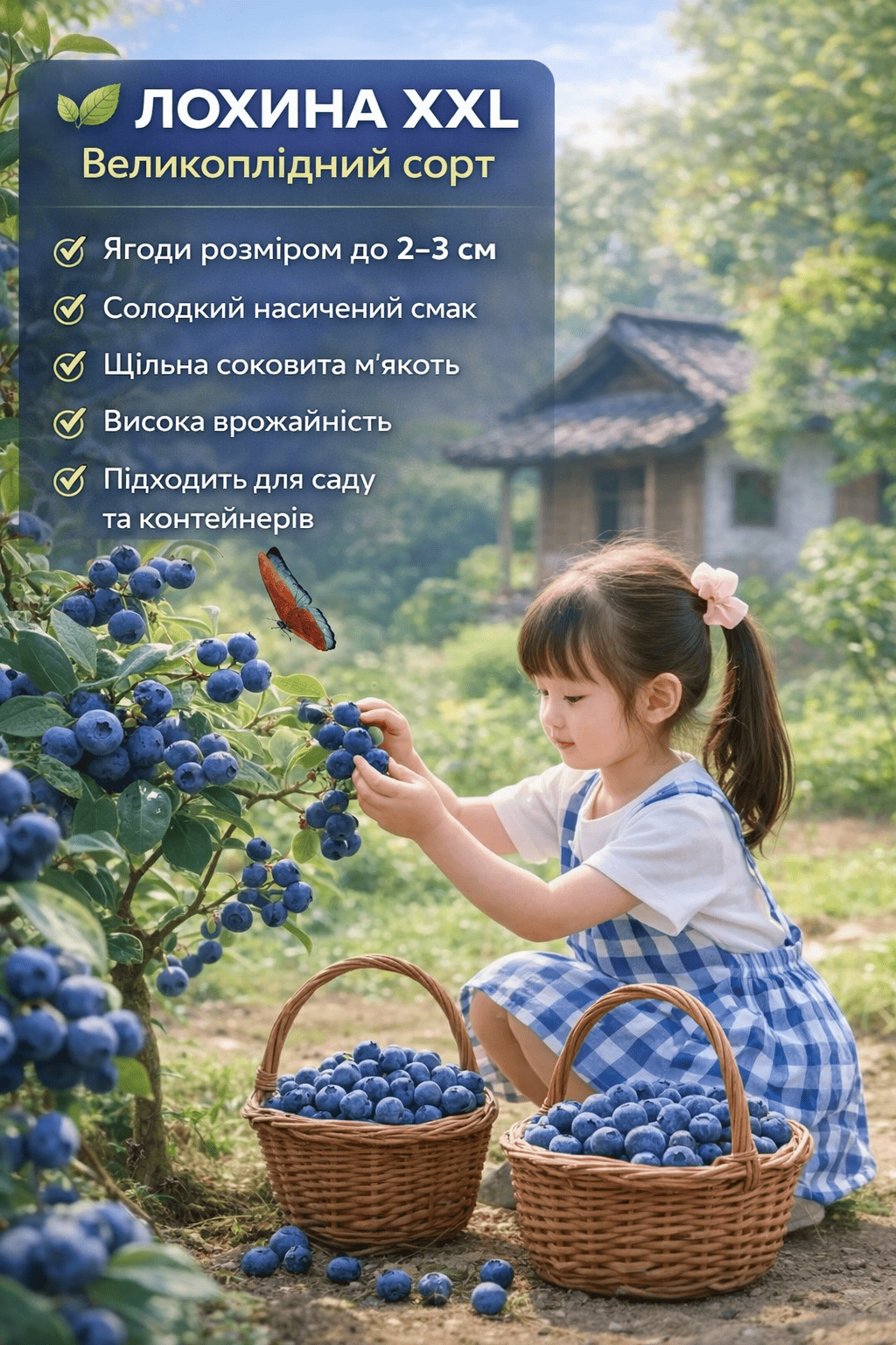 Замовляла навесні, висадила на ділянці. Кущ добре прийнявся, росте активно. Ягоди справді великі, значно більші за звичайну лохину. Смак солодкий, дітям дуже сподобалась.