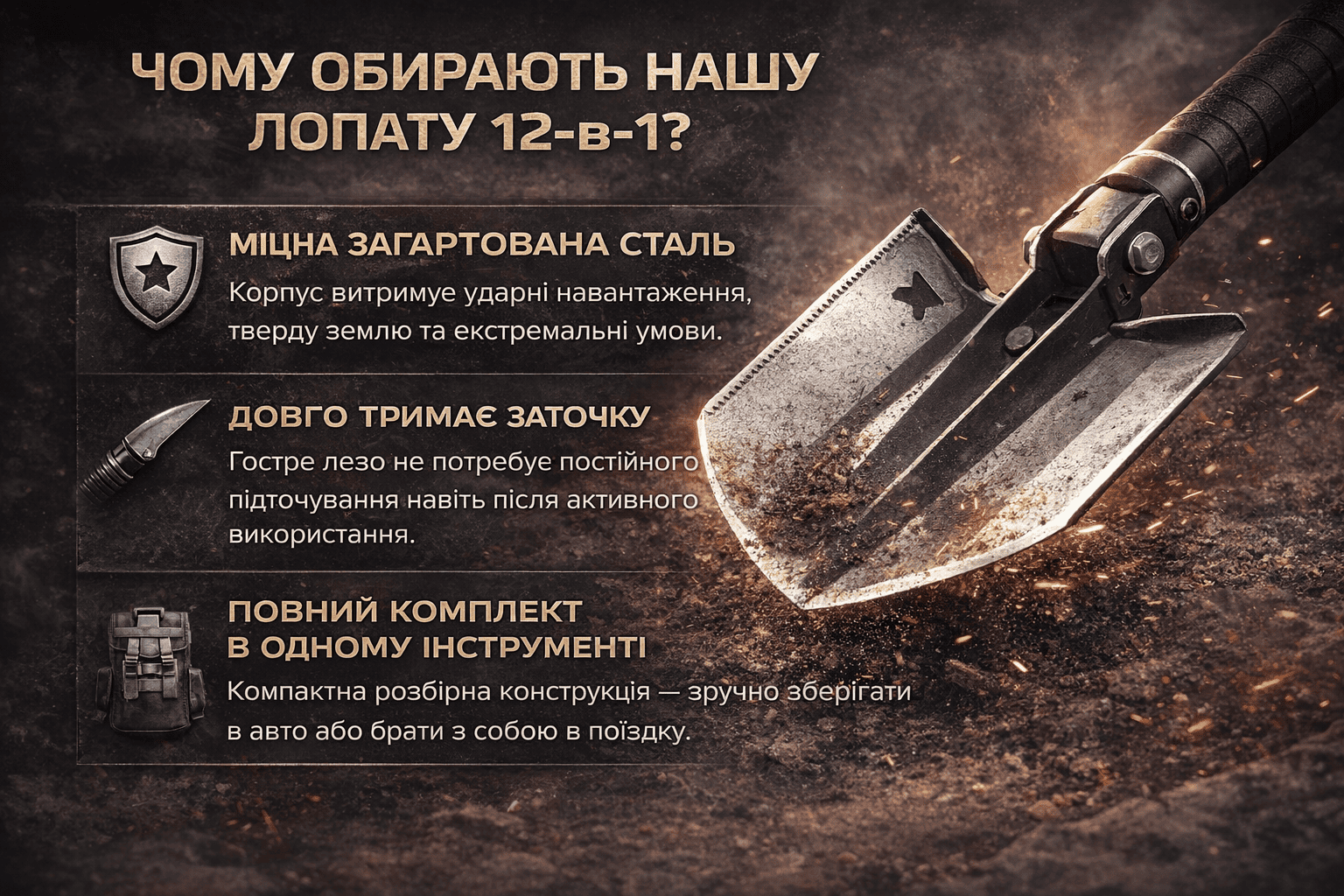 Заточка добре тримається, намався рубати коріння, відмінно справляється. Довга ручка. І пиляє і рубає і копає. Лопата дійсно здивувала. Дуже радий що придбав. Рекомендую.