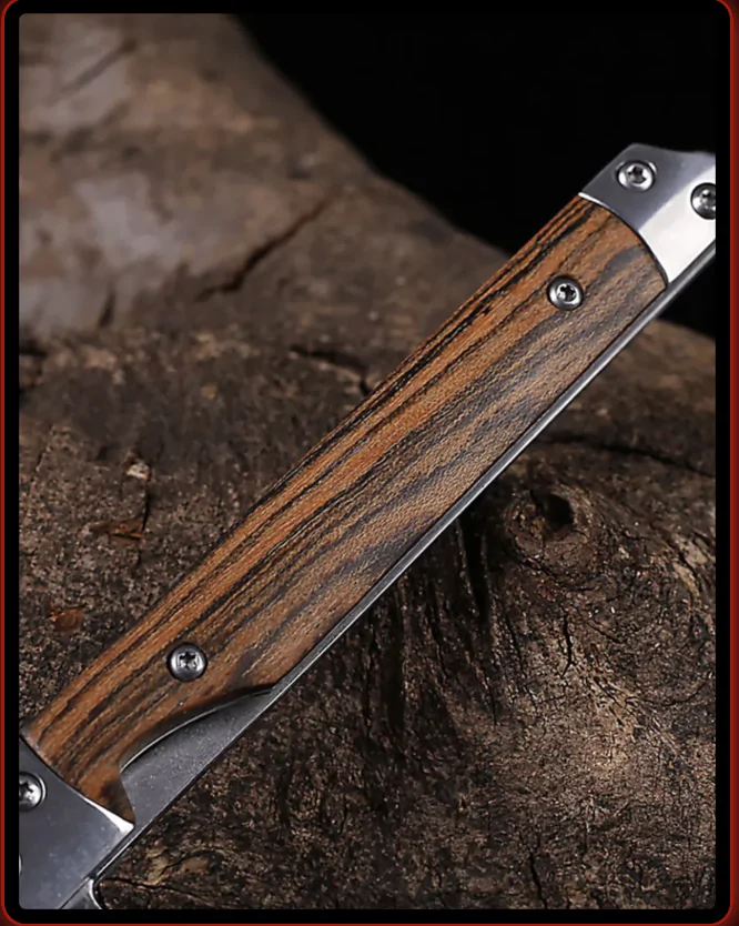 Цей ніж оснащений рукояткою, виготовленою з високоякісного дерева, яке має унікальні візерунки та текстуру зерна. Така натуральна деревина не лише надає естетичної привабливості інструменту, але й забезпечує відмінний контроль при використанні. Цей ніж деально підходить для різноманітних завдань, починаючи від різання мотузок і закінчуючи приготуванням їжі в умовах походу чи кемпінгу.